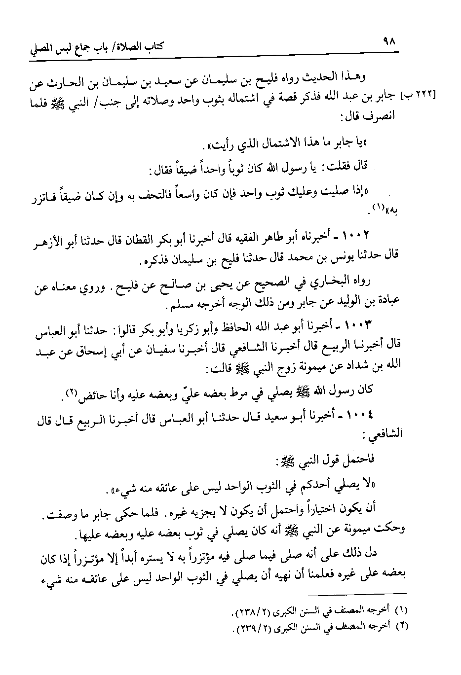 1004 أخبرنا أبو سعيد قال حدثنا أبو العباس قال اخبرنا الربيع قال قال الشافعي فاحتمل قول النبي صلى الله عليه وسلم : ( لا يصلي أحدكم في الثوب الواحد ليس على عاتقه منه شيء ) أن يكون اختيارا واحتمل أن يكون لا يجزيه غيره . فلما حكى جابر ما وصفت.