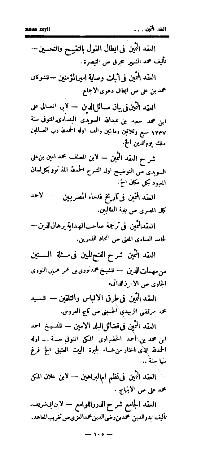 العقد الثمين في فضائل البلد الأمين - للشيخ أحمد ابن محمد بن أحمد الحضراوى المكي المتوفى سنة ... اوله الحمدلله الذي اختار من شاء لجيرة البيت العتيق إلخ فرغ منها سنة ... العقد الثمين في نظم أم البراهين - لابن علان المكي محمد علي ص الابتهاج.