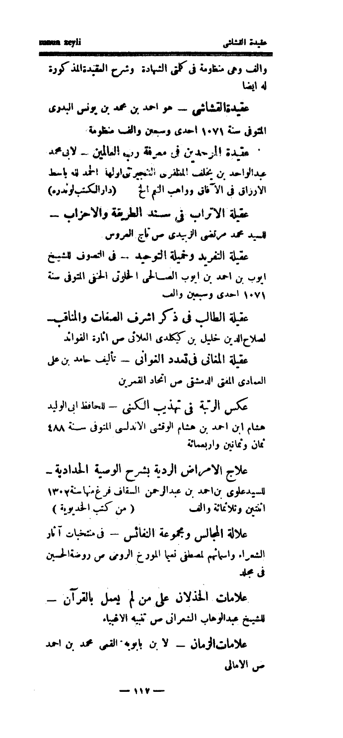 عقيدة القشاشي - هو أحمد بن محمد بن يونس البدري المتوفى سنة 1071 إحدى وسبعين وألف منظومة عقيدة الموحدين في معرفة رب العالمين - لأبي محمد عبد الواحد بن يخلف المظفري التنجيرنتى اولها الحمدلله باسط الأرزاق في الآفاق وواهب النعم إلخ (دار الكتب لوندره) عقيلة الأتراب في سند الطريقة والأحزاب - للسيد محمد مرتضى الزبيدي ص تاج العروس عقيلة التفريد وخميلة التوحيد - في التصوف للشيخ أيوب بن أحمد بن أيوب الصالحي الخلوتي الحنفي المتوفى سنة 1071 إحدى وسبعين وألف عقيلة الطالب في ذكر أشرف الصفات والمناقب - لصلاح الدين خليل بن كيكلدي العلائي ص ائارة الفوائد عقيلة المغاني في تعدد الغواني - تأليف حامد بن علي العمادي المفتي الدمشقي ص اتحاد القمرين عكس الرتبة في تهذيب الكنى - للحافظ أبي الوليد هشام ابن أحمد بن هشام الوقشي الأندلسي المتوفى سنة 488 ثمان وثمانين وأربعمائة علاج الأمراض الردية بشرح الوصية الحدادية - للسيد علوي بن احمد بن عبد الرحمن السقاف فرغ منها سنة 1302 اثنتين وثلاثمائة وألف (من كتب الخديوية) علالة المجالس ومجموعة النفائس - في منتخبات آثار الشعراء وأسمائهم لمصطفى نعيما المورخ الرومي ص روضة الحسين في مجلد