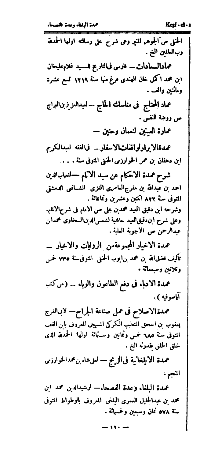 عمارة العنيين لنعمان وحنين - عمدة الأبرار لواقعات الأسفار - في الفقه لعبد الكريم ابن دهقان بن عمر الخوارزمي الحنفي المتوفى سنة ... شرح عمدة الأحكام عن سيد الأنام - لشهاب الدين احمد بن عبد الله بن مفرج العامري الغزي الشافعي الدمشقي المتوفى سنة 822 اثنتين وعشرين وثمانمائة.