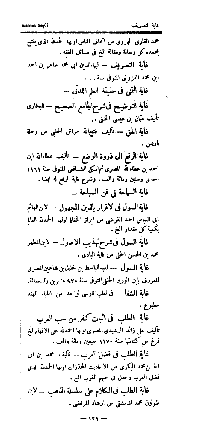 غاية التصريف - لبهاء الدين أبي محمد طاهر بن أحمد ابن محمد القزويني المتوفى سنة ... غاية التمني في حقيقة العلم اللدني - غاية التوضيح في شرح الجامع الصحيح - للبخاري تأليف عثمان بن عيسى الحنفي.