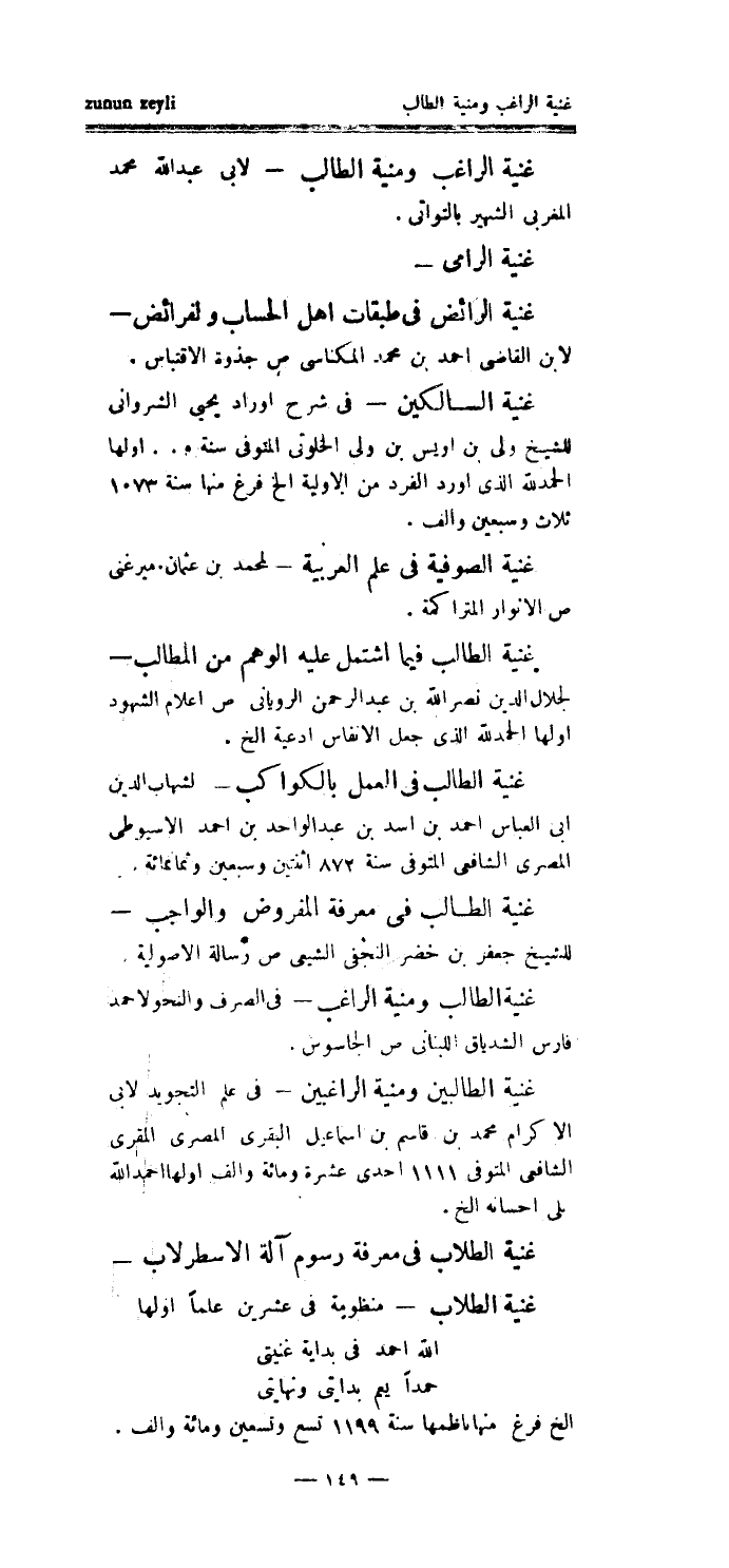 غنية الطلاب في معرفة رسوم آلة الاسطرلاب - غنية الطلاب - منظومة في عشرين علماً أولها الله أحمد في بداية غنيتي حمداً يعم بدايتي ونهايتي إلخ فرغ منها ناظمها سنة 1199 تسع وتسعين ومائة وألف.