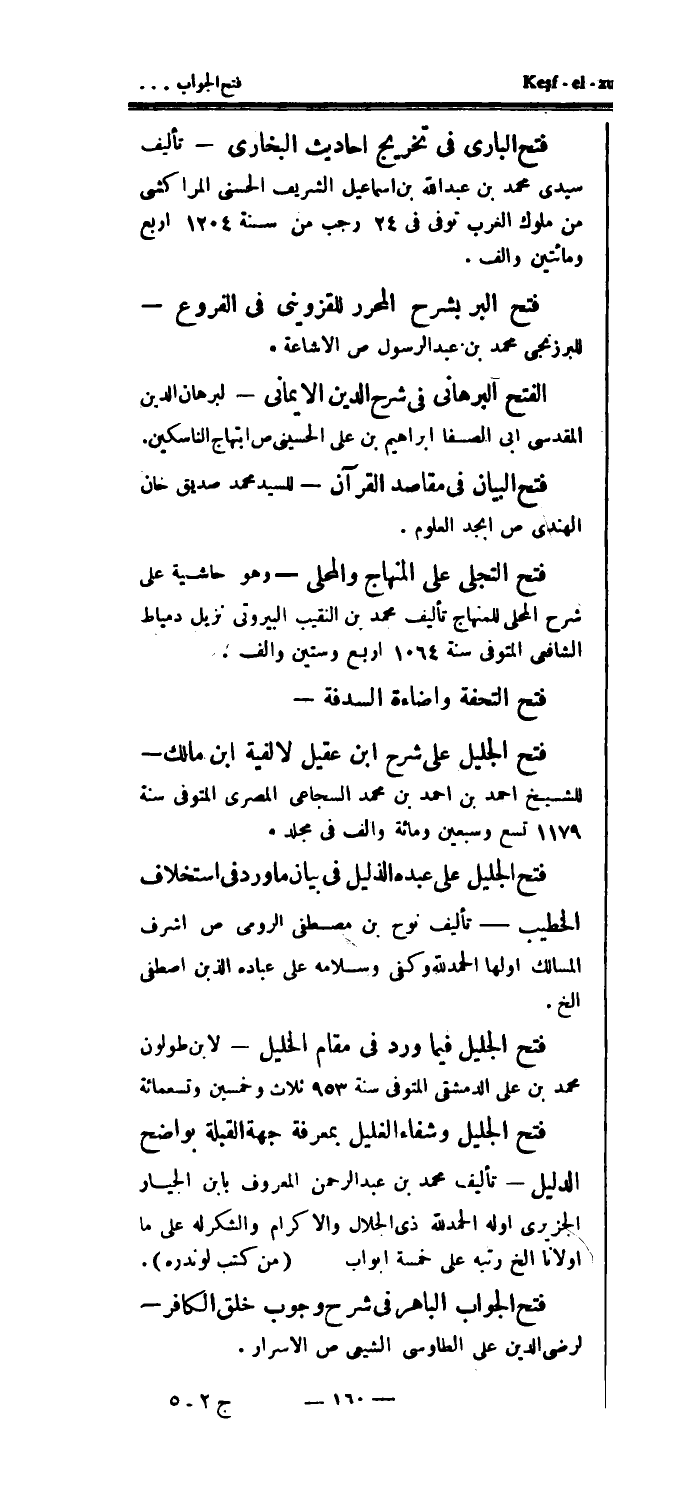فتح الجليل فيما ورد في مقام الخليل - لابن طولون محمد بن علي الدمشقي المتوفى سنة 953 ثلاث وخمسين وتسعمائة فتح الجليل وشفاء الغليل بمعرفة جهة القبلة بواضح الدليل - تأليف محمد بن عبد الرحمن المعروف بابن الجيار الجزيرى اوله الحمدلله ذي الجلال والإكرام والشكر له على ما أولانا إلخ رتبه على خمسة أبواب (من كتب لوندره) .
