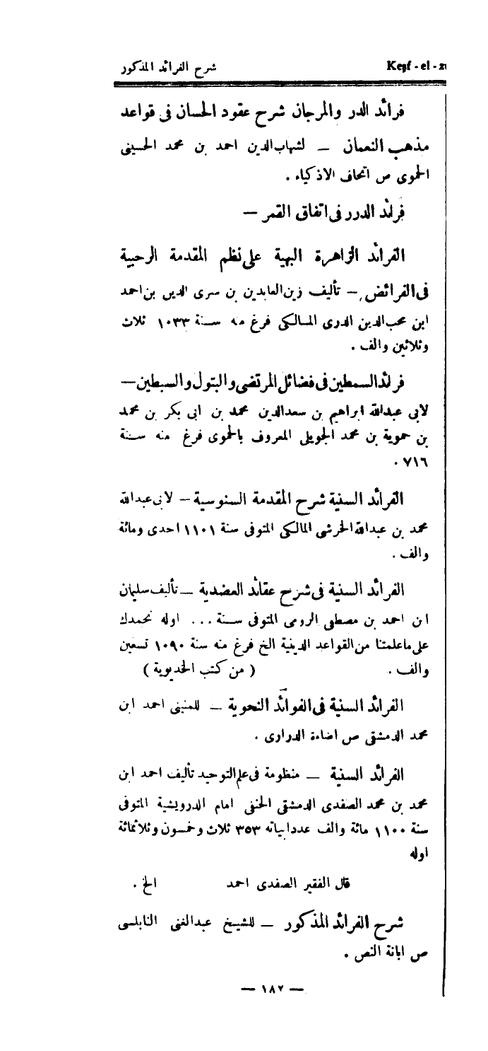 فرائد الدرر في اتفاق القمر - الفرائد الزاهرة البهية على نظم المقدمة الرجبية في الفرائض - تأليف زين العابدين بن سري الدين بن احمد ابن محب الدين الدري المالكي فرغ منه سنة 1033 ثلاث وثلاثين وألف.