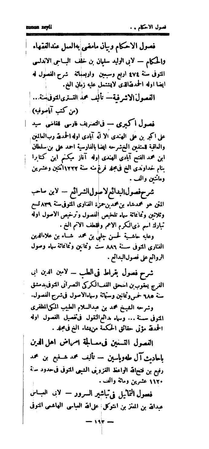 الفصول الأشرفية - تأليف محمد التستري المتوفى سنة ... (من كتب آياصوفية) فصول اكبرى - في التصريف فارسي للقاضي سيد علي أكبر بن علي الهندي الآله آبادى اوله الحمدلله رب العالمين والعاقبة للمتقين الخ شرحه أيضاً بالفارسية أحمد علي بن سلطان ابن محمد الفتح آبادي الهندي أوله آغاز ميكنم اين كتابرا بنام خداوندي ألخ في مجلد فرغ منه سنة 1222 اثنتين وعشرين ومائتين وألف.