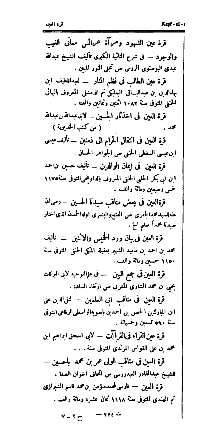 قرة عين القراء في القراآت - لأبي اسحق إبراهيم ابن محمد بن علي القواس المرندي المتوفى سنة ... قرة العين في مثاقب الولي عمر بن محمد باحسين - للشيخ عبد القادر العيدروسي ص إتحاف إخوان الصفا.