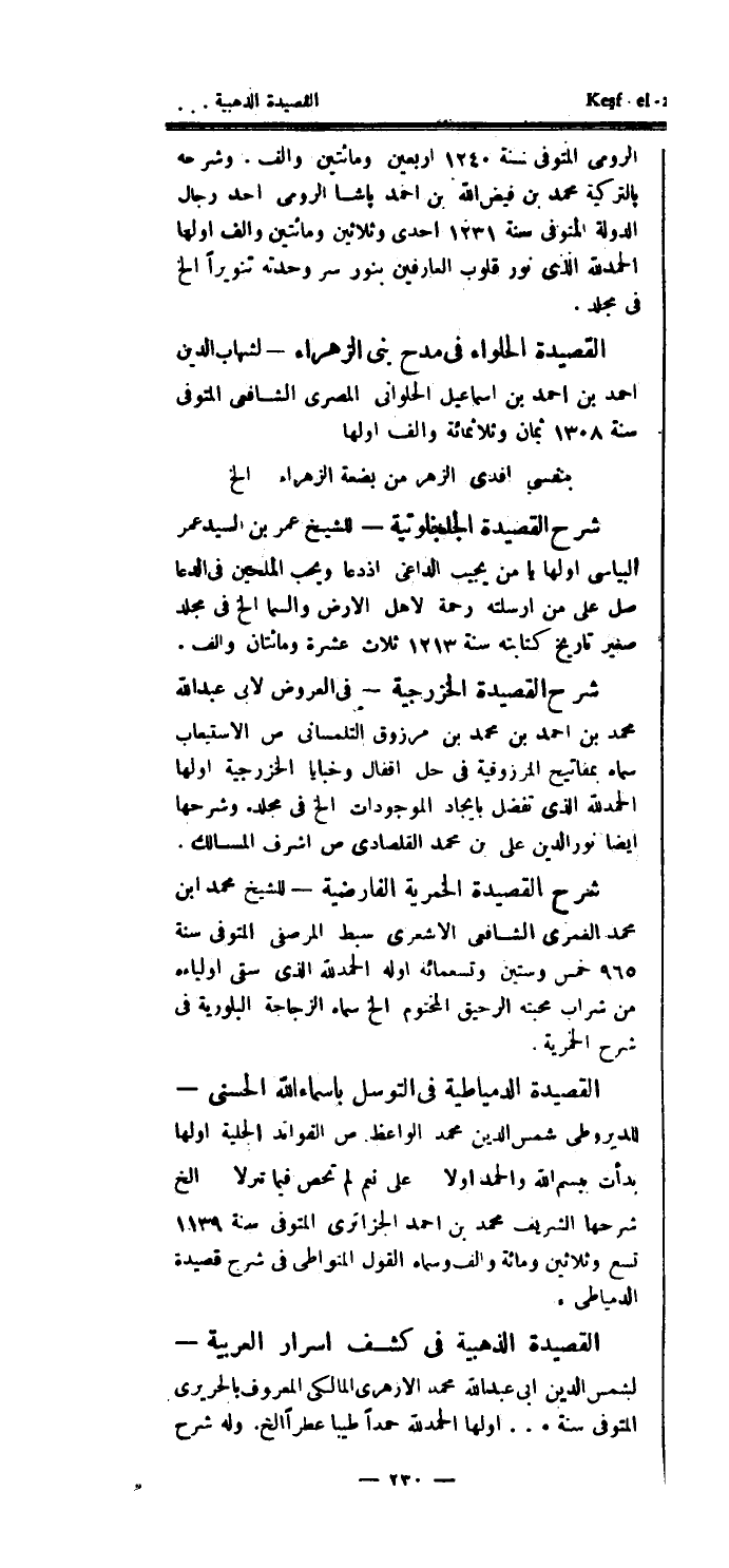 القصيدة الدمياطية فى التوسل بأسماء الله الحسنى - للديروطي شمس الدين محمد الواعظ ص الفوائد الجلية أولها بدأت ببسم الله والحمد أولاً على نعم لم تحص فيما تنزلا الخ شرحها الشريف محمد بن أحمد الجزائري المتوفى سنة 1139 تسع وثلاثين ومائة وألف وسماه القول المتواطي في شرح قصيدة