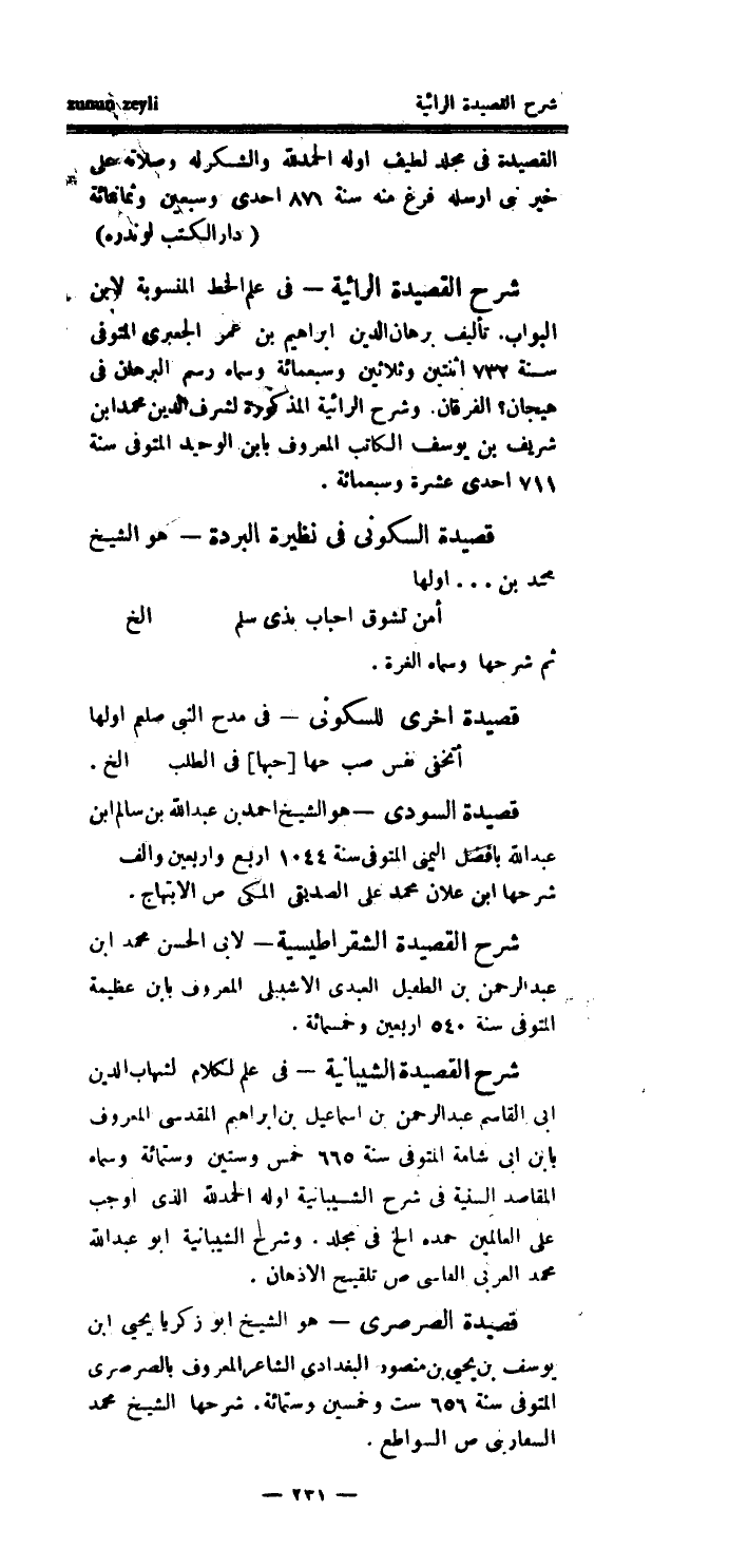 القصيدة في مجلد لطيف اوله الحمدلله والشكر له وصلاته على خير نبى أرسله فرغ منه سنة 871 إحدى وسبعين وثمانمائة (دار الكتب لوندره) شرح القصيدة الرائية - في علم الخط المنسوبة لابن البواب.