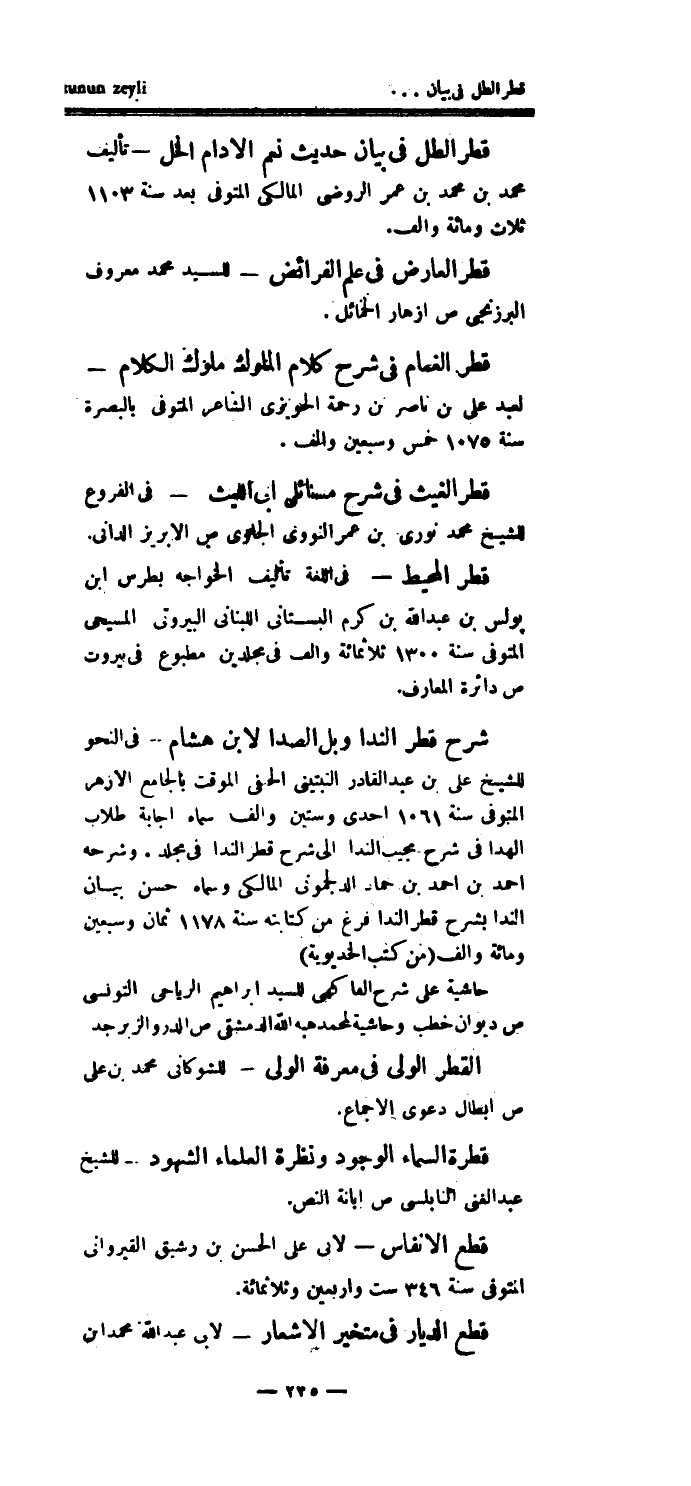 وشرحه أحمد بن أحمد بن حماد الدلجموني المالكي وسماه حسن بيان الندا بشرح قطر الندا فرغ من كتابته سنة 1178 ثمان وسبعين ومائة وألف (من كتب الخديوية) حاشية على شرح الفاكهي للسيد إبراهيم الرياحي التونسي