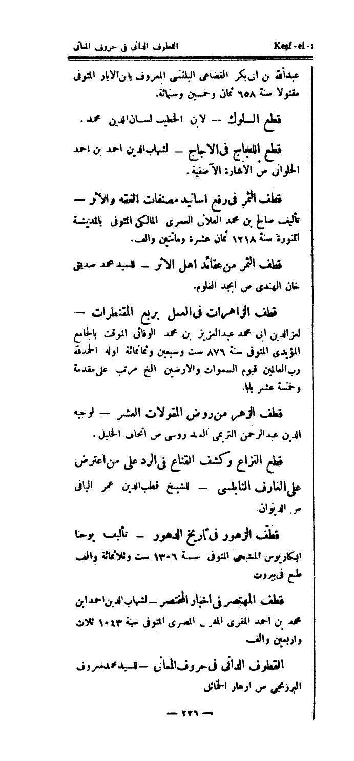 قطع النزاع وكشف القناع في الرد على من اعترض على العارف النابلسي - للشيخ قطب الدين عمر اليافي ص الديوان قطف الزهور في تاريخ الدهور - تأليف يوحنا البكاريوس المسيحي المتوفى سنة 1306 ست وثلاثمائة وألف طبع في بيروت قطف المهتصر في أخبار المختصر - لشهاب الدين أحمد ابن محمد بن أحمد المقرى المغربي المصري المتوفى سنة 1043 ثلاث وأربعين وألف القطوف الداني في حروف المعاني - للسيد محمد معروف البرزنجي ص أزهار الخمائل