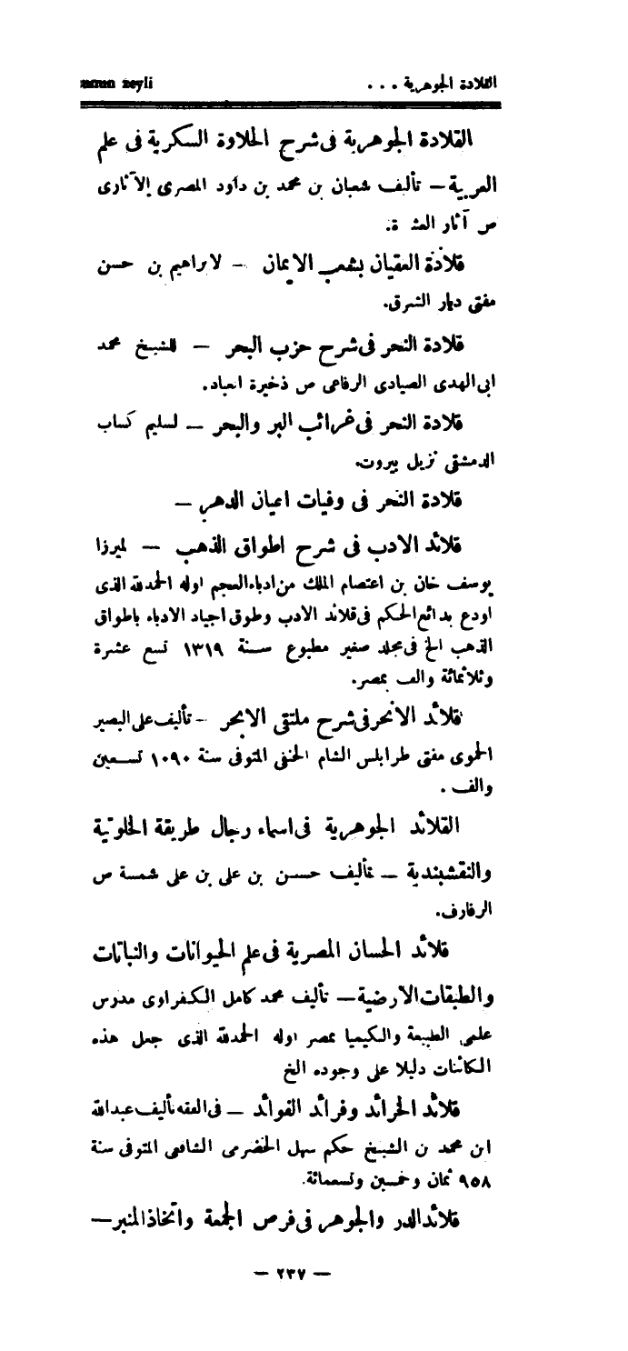 قلائد الحسان المصرية في علم الحيوانات والنباتات والطبقات الأرضية - تأليف محمد كامل الكفراوي مدرس علمي الطبيعة والكيميا بمصر اوله الحمدلله الذي جعل هذه الكائنات دليلاً على وجوده الخ قلائد الخرائد وفرائد الفوائد - في الفقه تأليف عبد الله ابن محمد بن الشيخ حكم سهل الحضرمي الشافعي المتوفى سنة 958 ثمان وخمسين وتسعمائة.