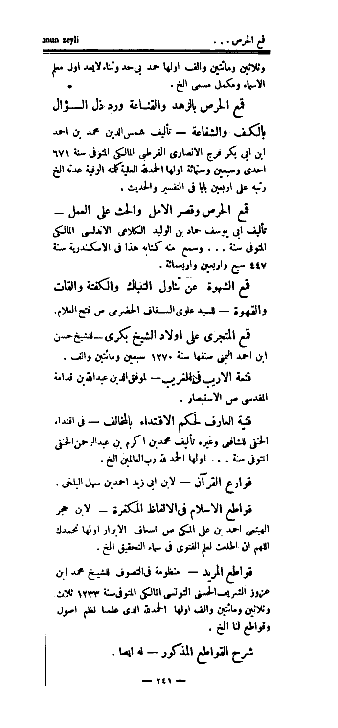 قمع الحرص بالزهد والقناعة ورد ذل السؤال بالكف والشفاعة - تأليف شمس الدين محمد بن أحمد ابن أبي بكر فرج الأنصاري القرطبي المالكي المتوفى سنة 671 إحدى وسبعين وستمائة أولها الحمد لله العلية كلمته الوفية عدته الخ رتبه على أربعين باباً في التفسير والحديث.