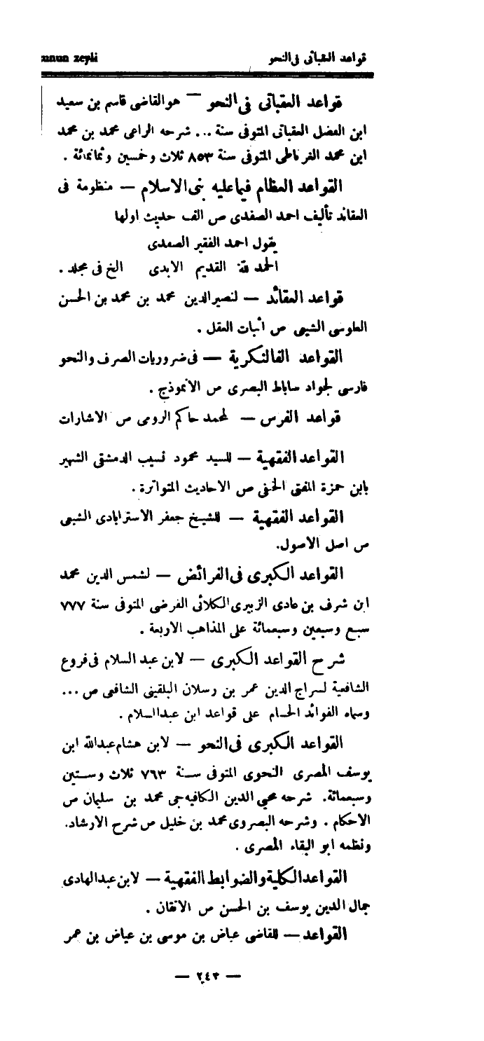 قواعد العقباتى في النحو - هو القاضي قاسم بن سعيد ابن الفضل العقباتى المتوفى سنة ... شرحه الراعي محمد بن محمد ابن محمد الغرناطي المتوفى سنة 853 ثلاث وخمسين وثمانمائة.