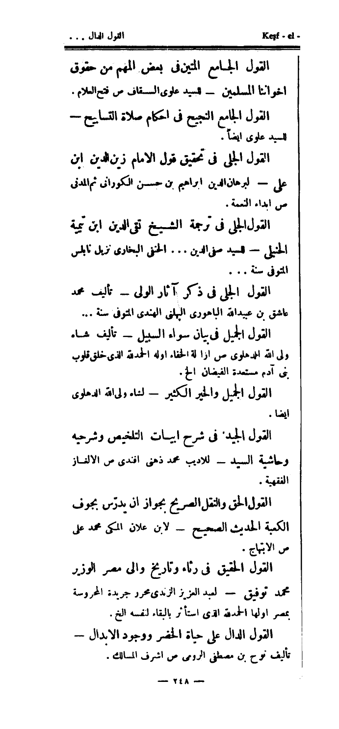القول الجلي في ترجمة الشيخ تقي الدين ابن تميية الحنبلي - للسيد صفي الدين ... الحنفي البخاري نزيل نابلس المتوفى سنة ... القول الجلي في ذكر آثار الولي - تأليف محمد عاشق بن عبيد الله الباهورى الپهلنى الهندي المتوفى سنة ... القول الجميل في بيان سواء - السبيل تأليف شاه ولي الله الدهلوي ص إزالة الخفاء أوله الحمدلله الذي خلق قلوب بني آدم مستعدة الفيضان الخ.
