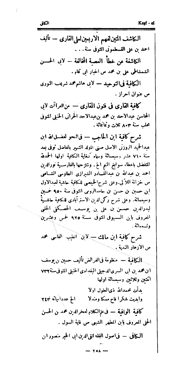 الكافية - منظومة في الفرائض تأليف حسين بن يوسف ابن محمد بن أبي السري الدجيلي البغدادي الحنبلي المتوفى سنة 732 اثنتين وثلاثين وسبعمائة اولها بدأت بحمدالله ذي الطول أولا وأبديت شكراً فاح مسكاً ومندلا الخ عدد أبياته 243 كافية الوافية - في علم الكلام لفخر الدين محمد بن الحسن الحلي المعروف بابن المطهر الشيعي ص غاية السول.
