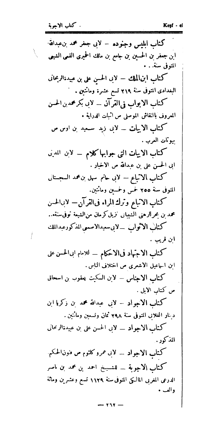 كتاب الإتباع وترك المراء في القرآن - لأبي الحسن محمد بن بحر الرهني الشيباني نزيل كرمان من الشيعة توفى سنة ... كتاب الأثواب - لأبي سعيد الأصمعي المذكور عبد الملك ابن قريب.