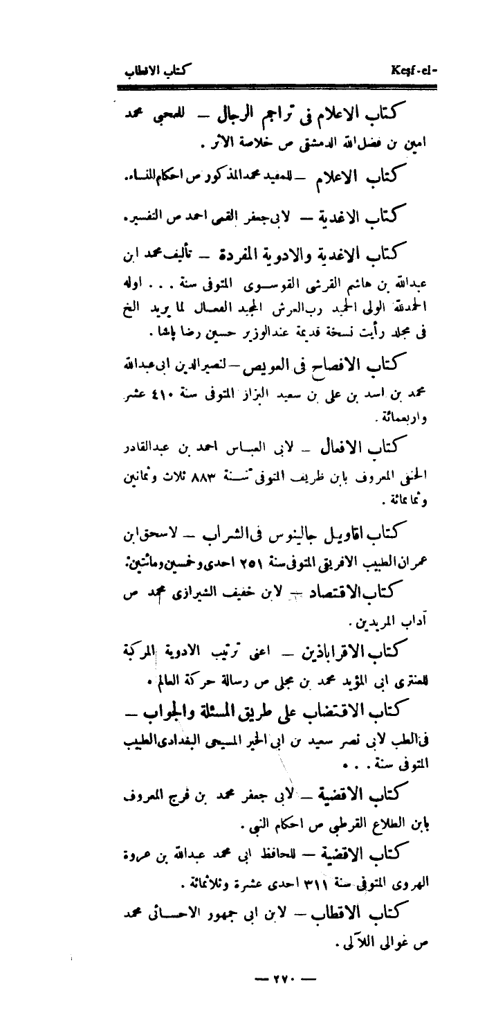 كتاب الاقتضاب على طريق المسألة والجواب - في الطب لأبي نصر سعيد بن أبي الخير المسيحي البغدادي الطبيب المتوفى سنة ... كتاب الأقضية - لأبي جعفر محمد بن فرج المعروف بابن الطلاع القرطبي ص أحكام النبي.
