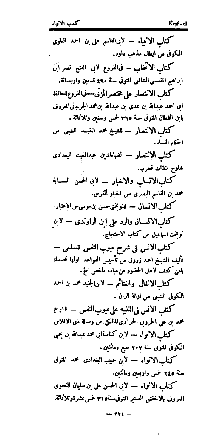 كتاب الإنس في التنبيه على عيوب النفس - للشيخ محمد بن علي الخروبي الجزائري المالكي ص رسالة ذي الإفلاس كتاب الأنواء - لابن كناسة أبي محمد عبد الله بن يحيى الكوفي المتوفى سنة 207 سبع ومائتين.