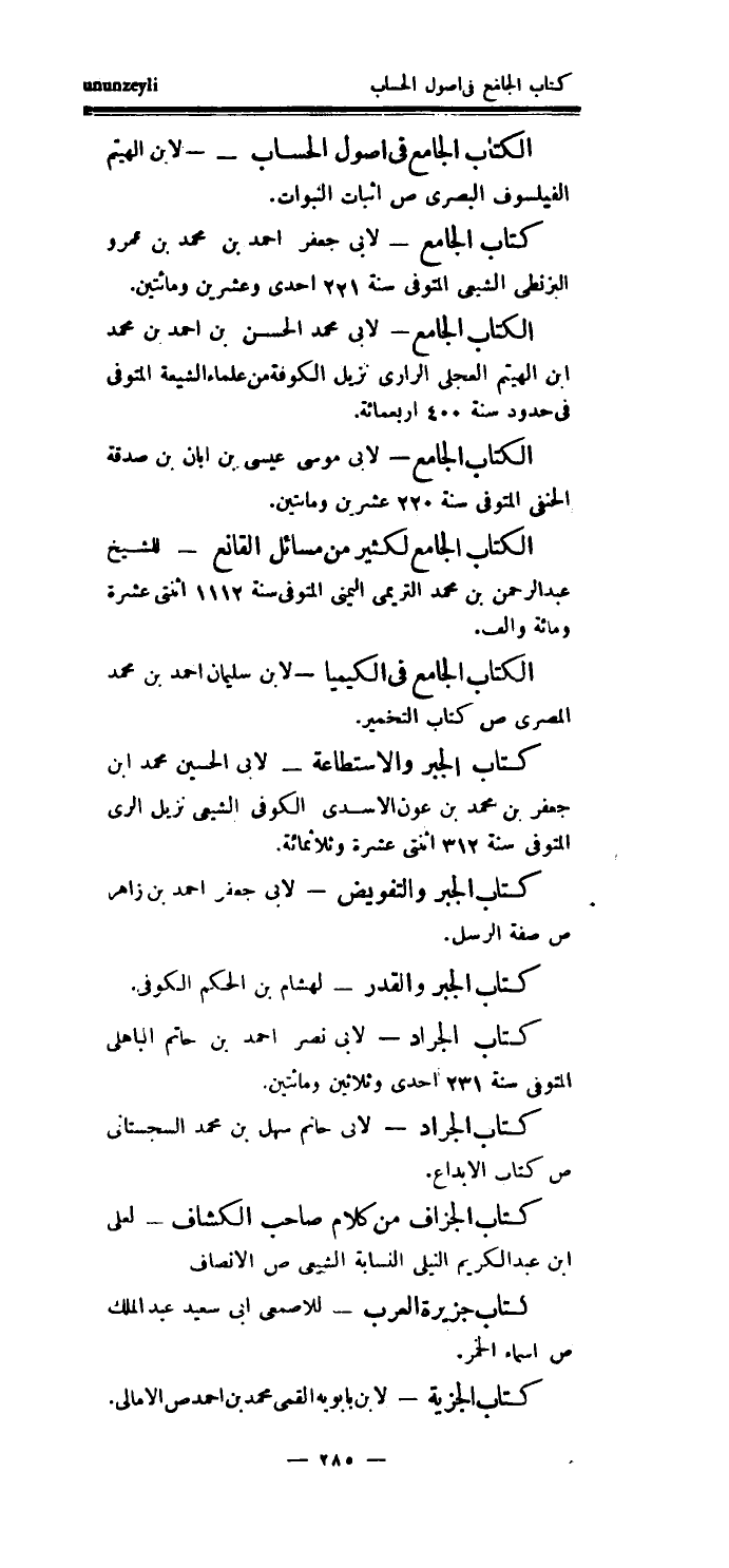 كتاب الجزاف من كلام صاحب الكشاف - لعلي ابن عبد الكريم النيلي النسابة الشيعي ص الأنصاف كتاب جزيرة العرب - للأصمعي أبي سعيد عبد الملك ص أسماء الخمر.