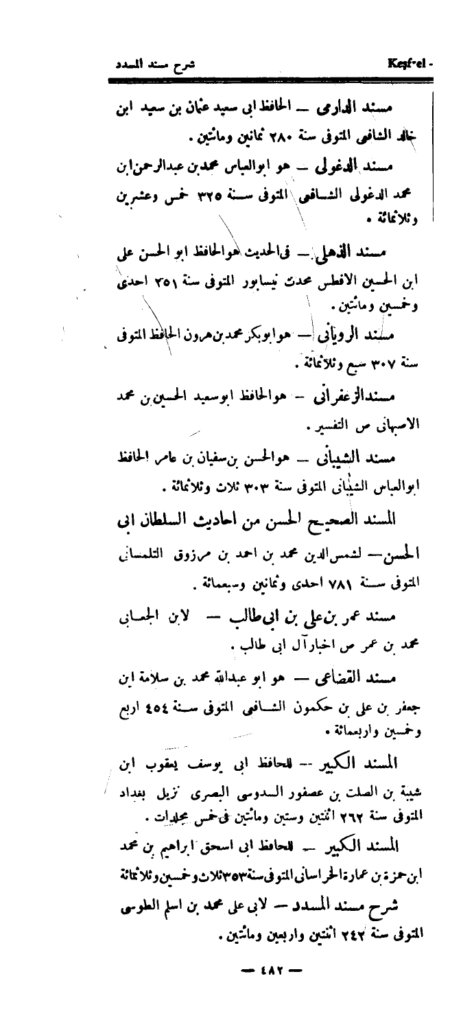 المسند الكبير للحافظ أبي أسحق إبراهيم بن محمد ابن حمزة بن عمارة الخراساني المتوفى سنة 353 ثلاث وخمسين وثلاثمائة شرح مسند المسدر لأبي علي محمد بن اسلم الطوسي المتوفى سنة 242 اثنتين وأربعين ومائتين.