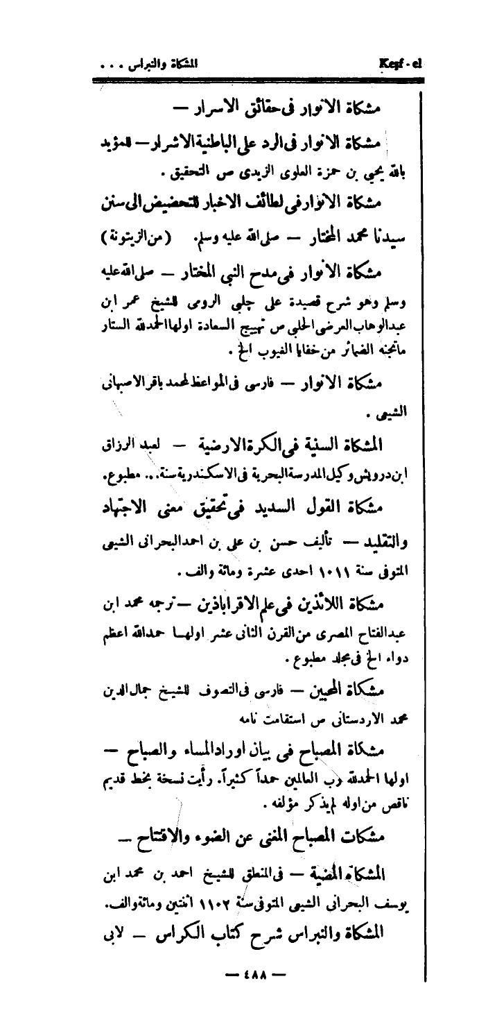 مشكاة المصباح المغنى عن الضوء والافتتاح مشكات المضية في المنطق للشيخ أحمد بن محمد ابن يوسف البحراني الشيعي المتوفى سنة 1102 اثنتين ومائة وألف.