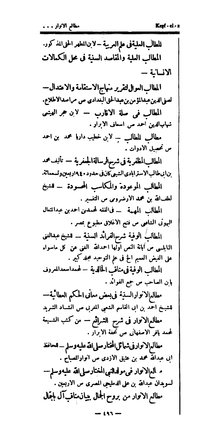 مطالع الأنوار السنية في بعض معاني الحكم العطائية للشيخ احمد بن أبي القاسم الشعبي المغربي ص انشاد الشريد مطالع الأنوار في شرح الشرائع من كتب الشيعة لمحمد باقر الأصفهاني ص تحفة الأبرار.