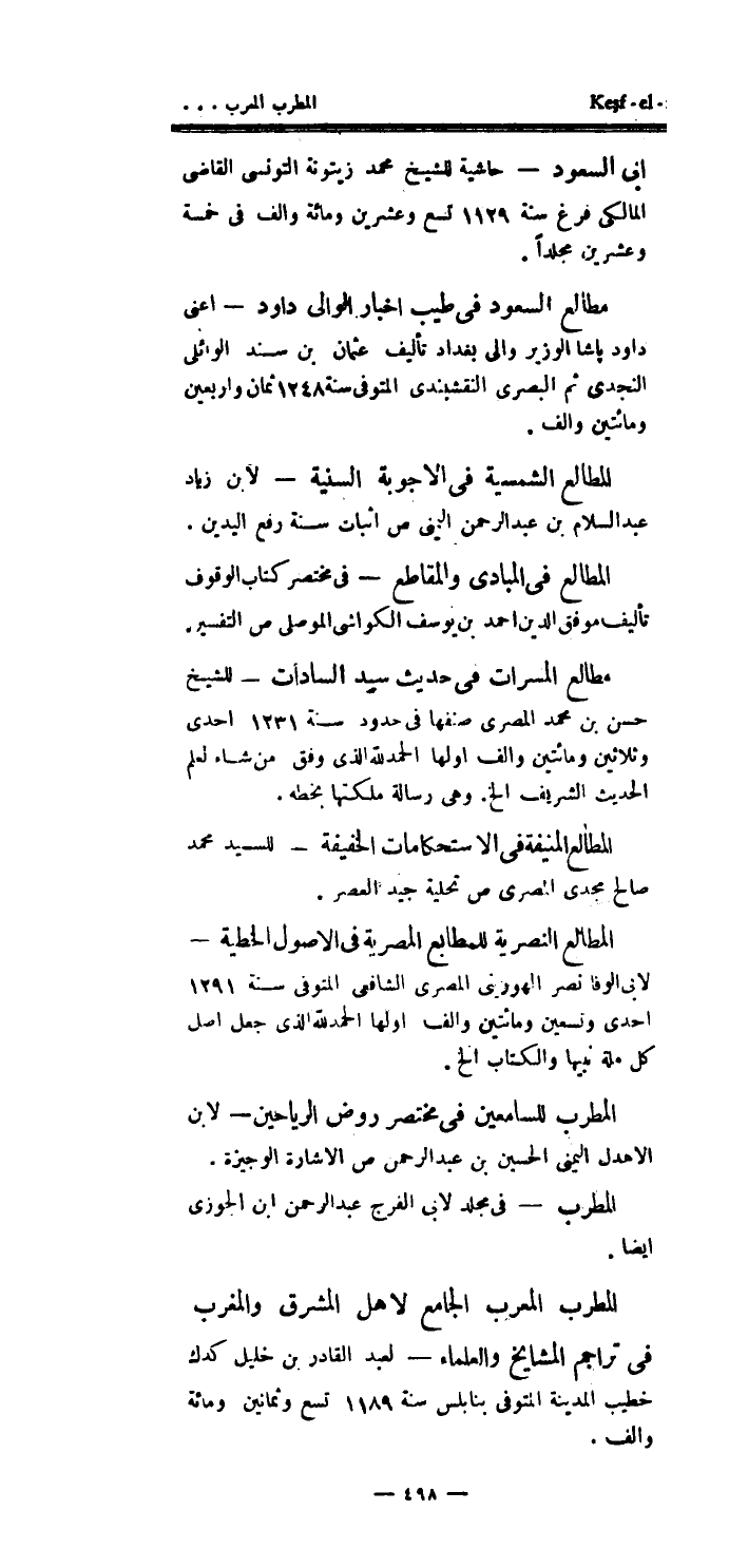 المطرب المعرب الجامع لأهل المشرق والمغرب في تراجم المشايخ والعلماء - لعبد القادر بن خليل كدك خطيب المدينة المتوفى بنابلس سنة 1189 تسع وثمانين ومائة وألف.
