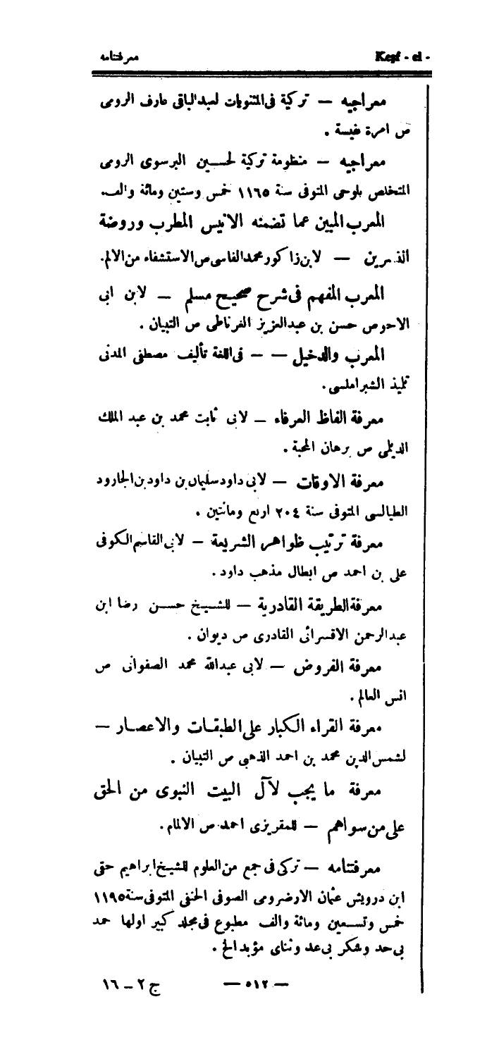 معرفتنامه - تركي في جمع من العلوم للشيخ ابرهيم حقي ابن درويش عثمان الأرضرومي الصوفي الحنفي المتوفى سنة 1195 خمس وتسعين ومائة وألف مطبوع في مجلد كبير أولها حمد بي حد وشكر بي عد وثناي مؤبد الخ.