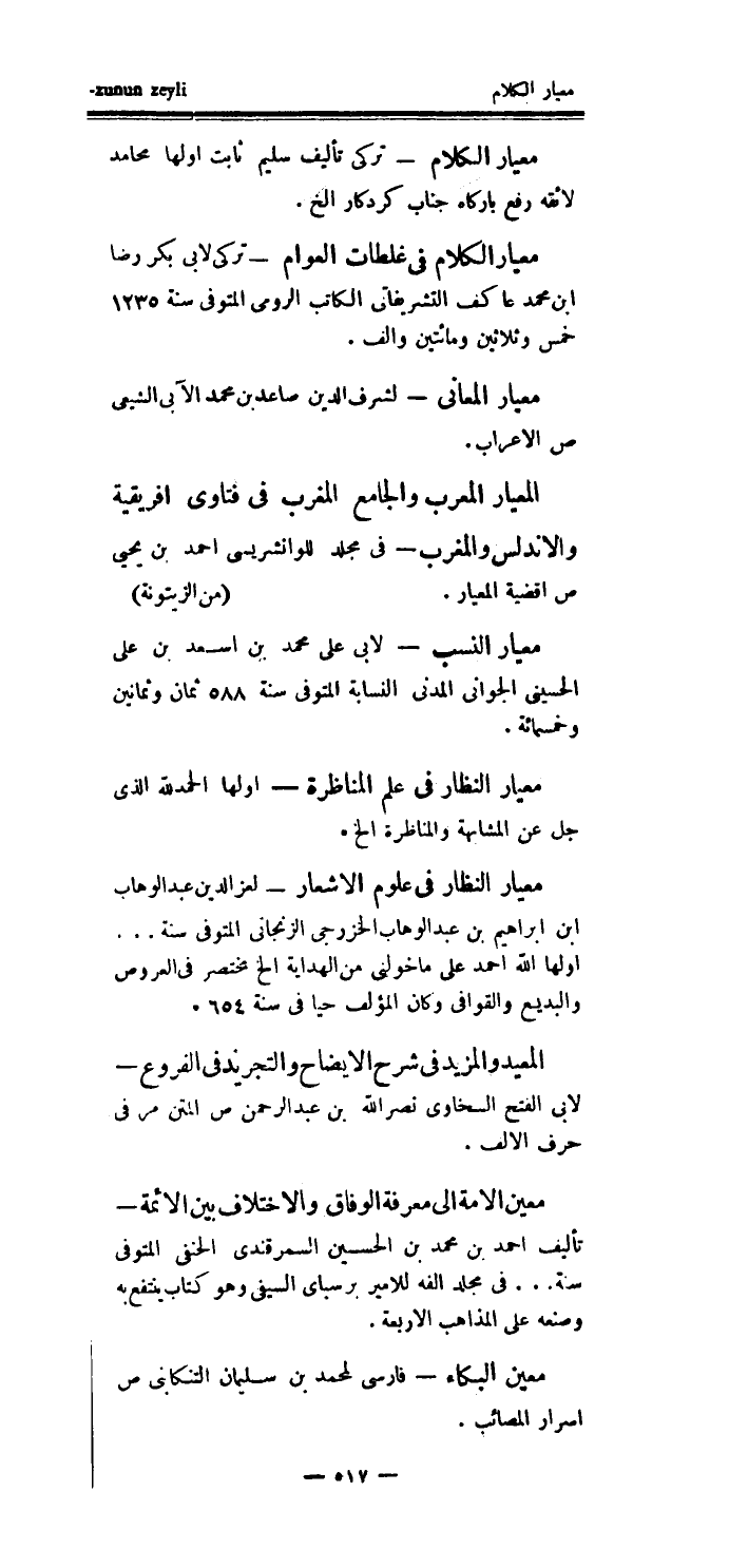 معيار الكلام في غلطات العوام - تركي لأبي بكر رضا ابن محمد عاكف التشريفاتي الكاتب الرومي المتوفى سنة 1235 خمس وثلاثين ومائتين وألف.