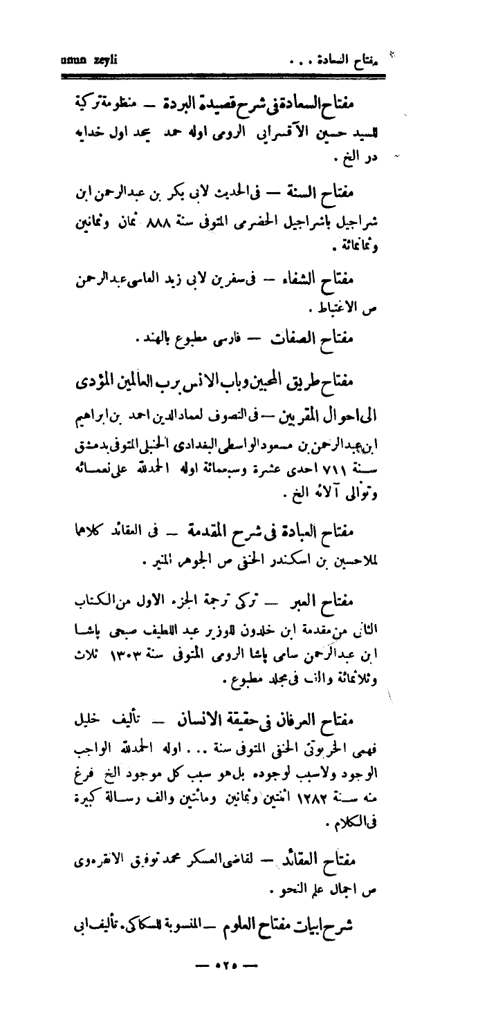مفتاح السعادة في شرح قصيدة البردة - منظومة تركية للسيد حسين الآقسرايى الرومي أوله حمد بيحد اول خداية در الخ.
