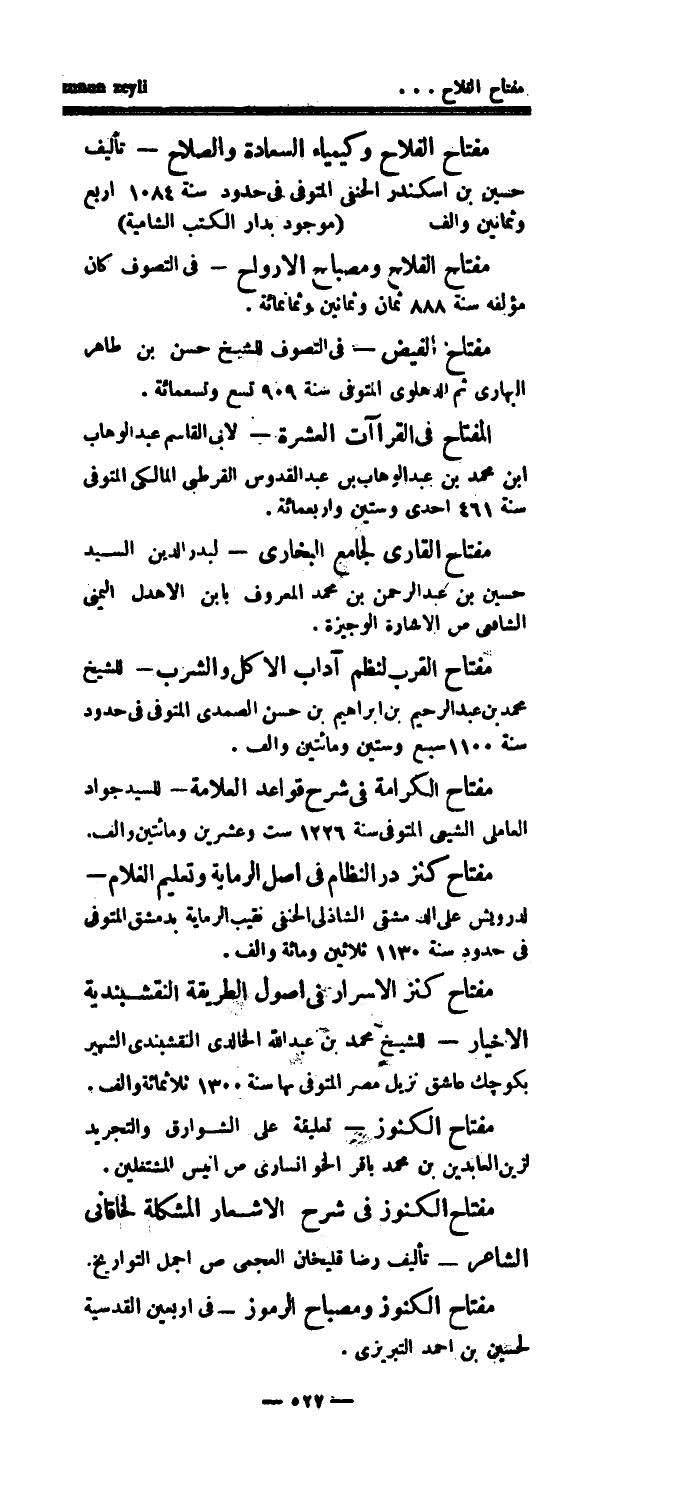 مفتاح الفلاح وكيمياء السعادة والصلاح - تأليف حسين بن اسكندر الحنفي المتوفى في حدود سنة 1084 أربع وثمانين وألف (موجود بدار الكتب الشامية) مفتاح الفلاح ومصباح الأرواح - في التصوف كان مؤلفه سنة 888 ثمان وثمانين وثمانمائة.
