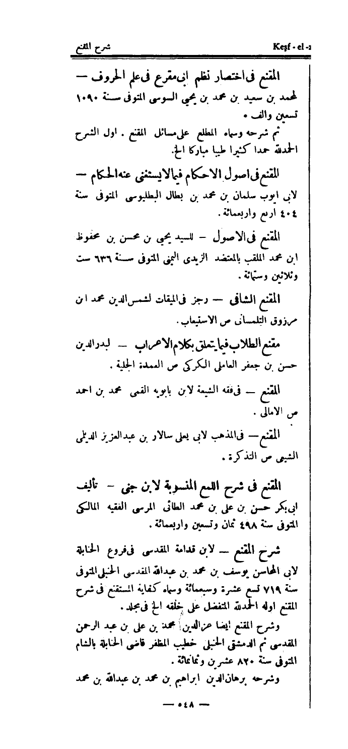 شرح المقنع - لابن قدامة المقدسي في فروع الحنابلة لأبي المحاسن يوسف بن محمد بن عبد الله المقدسي الحنبلي المتوفى سنة 719 تسع عشرة وسبعمائة وسماه كفاية المستقنع في شرح المقنع اوله الحمدلله المتفضل على خلقه ألخ في مجلد.