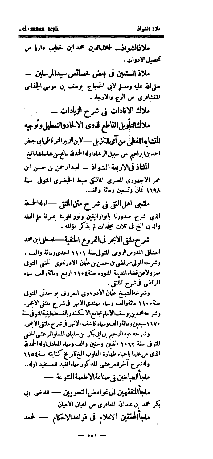 ملاك الإفادات في شرح الزيادات - ملاك التأوبل القاطع لذوي الإلحاد والتعطيل وتوجيه - المتشابه اللفظي من آي التنزيل - لابن الزبير الغرناطي أبي جعفر أحمد بن إبراهيم ص سبيل الرشاد اوله الحمدلله مانح من شاء ما شاء إلخ الملتاذ في الأربعة الشواذ - لعبد الرحمن بن حسن ابن عمر الأجهوري المصري المالكي سبط الخيضري المتوفى سنة 1198 ثمان وتسعين ومائة وألف.