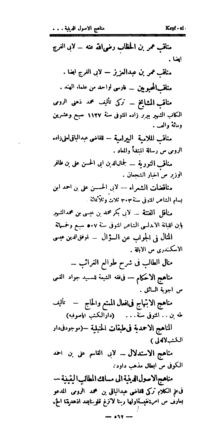 المناهج الأحمدية في طبقات الحنبلية (موجود في دار الكتب لاله لي) مناهج الاستدلال - لأبي القاسم علي بن أحمد الكوفي ص أبطال مذهب داود.