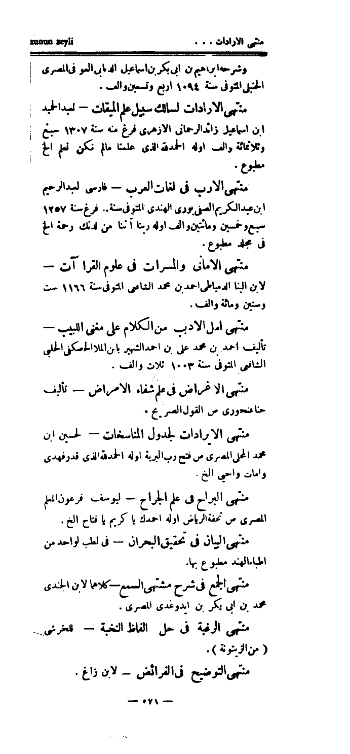 منتهي الإرادات لسالك سبيل علم الميقات - لعبد الحميد ابن إسماعيل زائد الرحماني الأزهري فرغ منه سنة 1307 سبع وثلاثمائة وألف أوله الحمدلله الذي علمنا ما لم نكن نعلم الخ مطبوع.