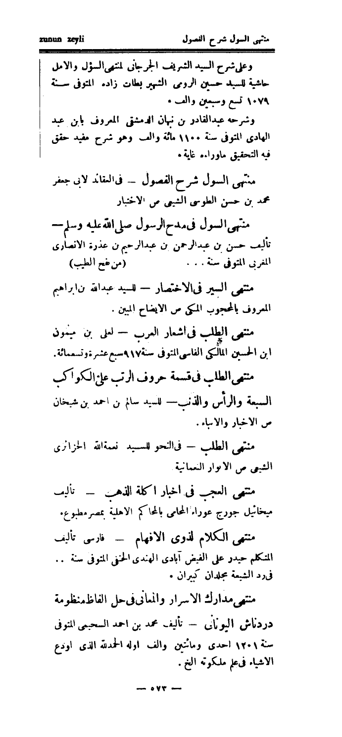 وعلى شرح السيد الشريف الجرجاني لمنتهى السؤل والأمل حاشية للسيد حسين الرومي الشهير بطات زاده المتوفى سنة 1079 تسع وسبعين والف.