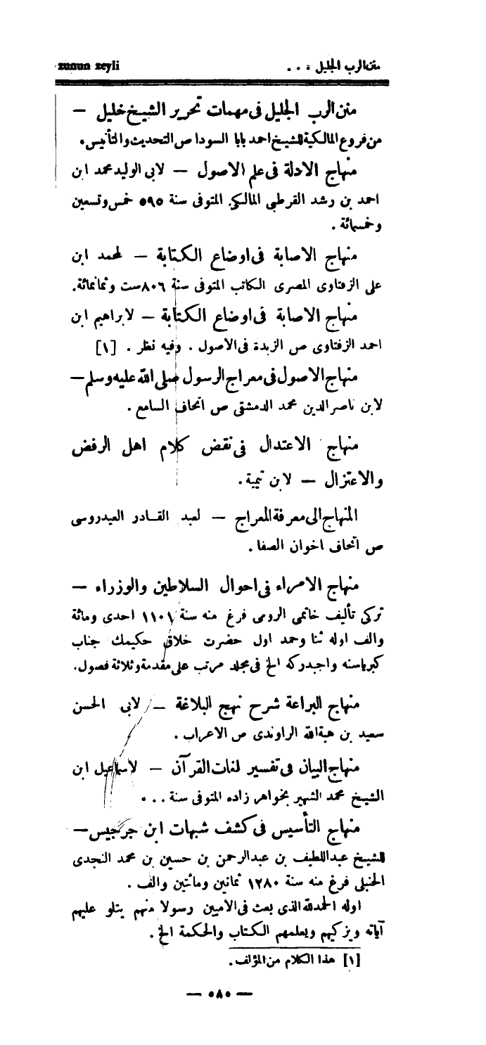 منهاج البيان في تفسير لغات القرآن - لإسماعيل ابن الشيخ محمد الشهير بخواهر زاده المتوفى سنة ... منهاج التأسيس في كشف شبهات ابن جرجيس - للشيخ عبد اللطيف بن عبد الرحمن بن حسين بن محمد النجدي الحنبلي فرغ منه سنة 1280 ثمانين ومائتين وألف.
