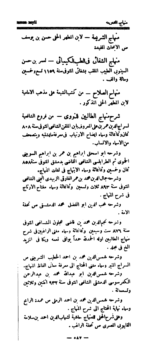 منهاج الشريعة - لابن المطهر الحلي حسن بن يوسف ص الأبحاث المفيدة منهاج الشفائي في الطب الكيميائي - لعمر بن حسن السينوبى الطبيب الملقب بشفائي المتوفى سنة 1159 تسع وخمسين ومائة وألف.