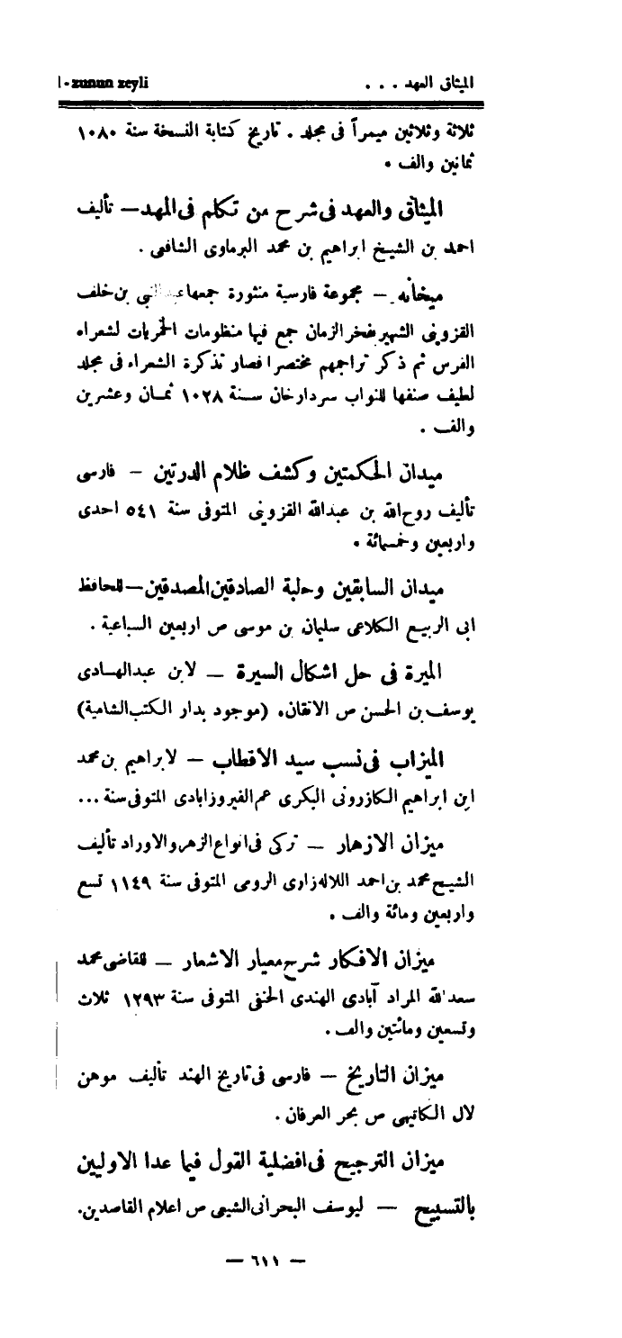 (موجود بدار الكتب الشامية) الميزاب في نسب سيد الأقطاب - لإبراهيم بن محمد ابن إبراهيم الكازروني البكري عم الفيروزابادى المتوفى سنة ... ميزان الأزهار - تركى في أنواع الزهر والأوراد تأليف الشيخ محمد بن أحمد اللاله زاري الرومي المتوفى سنة 1149 تسع وأربعين ومائة وألف.