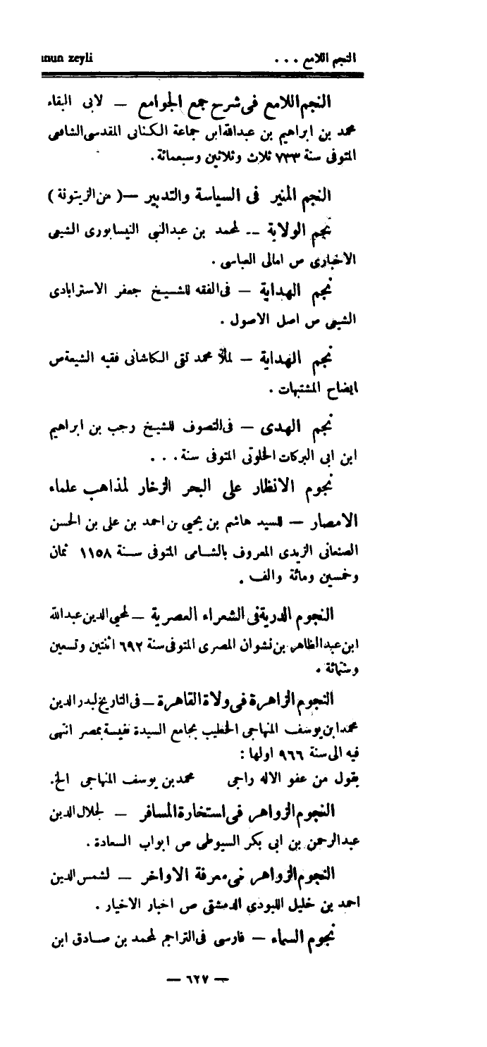 نجم الهدى - في التصوف للشيخ رجب بن إبراهيم ابن أبي البركات الخلوتي المتوفى سنة ... نجوم الأنظار على البحر الزخار لمذاهب علماء الأمصار - للسيد هاشم بن يحيى بن أحمد بن علي بن الحسن الصنعاني الزيدي المعروف بالشامي المتوفى سنة 1158 ثمان وخمسين ومائة وألف.