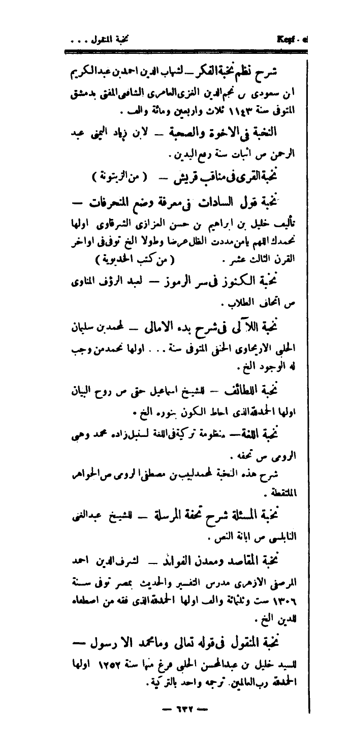نخبة المنقول في قوله تعالى وما محمد إلا رسول - للسيد خليل بن عبد المحسن الحلبي فرغ منها سنة 1252 اولها الحمدلله رب العالمين.