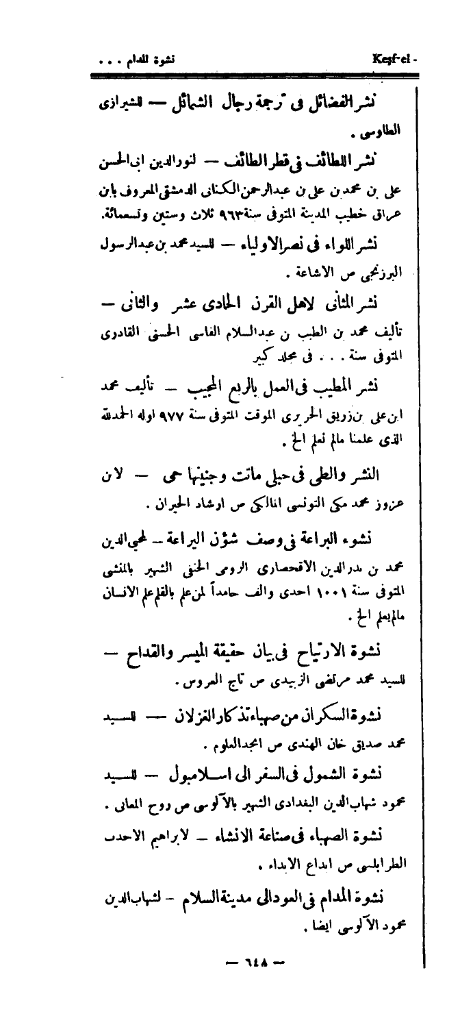 نشر المثاني لأهل القرن الحادي عشر والثاني - تأليف محمد بن الطيب بن عبد السلام الفاسي الحسني القادري المتوفى سنة ... في مجلد كبير نشر المطيب في العمل بالربع المجيب - تأليف محمد ابن علي بن زريق الحريري الموقت المتوفى سنة 977 اوله الحمدلله الذي علمنا ما لم نعلم الخ.