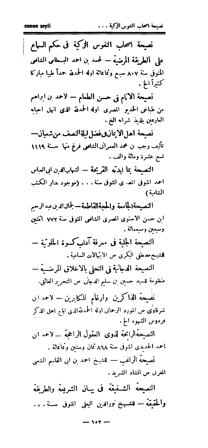 نصيحة أصحاب النفوس الزكية في حكم السماع على الطريقة المرضية - لمحمد بن أحمد البسطامي الشافعي المتوفى سنة 807 سبع وثمانمائة اوله الحمدلله حمداً طيباً مباركاً كثيراً الخ.