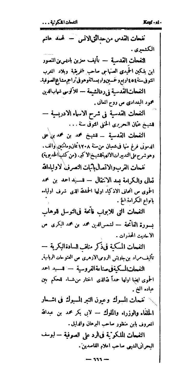 النفحات القدسية في شرح الأسماء الإدريسية - للشيخ عثمان التحريرى الحنفي المتوفى سنة ... النفحات القدسية - للشيخ محمد بن محمد بن على الدمونى فرغ منها في شعبان من سنة 1208 ثمان ومائتين وألف.