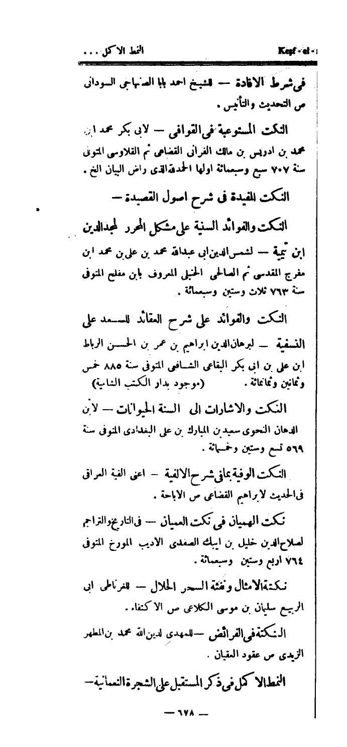 النكت المستوعبة في القوافي - لأبي بكر محمد ابن محمد بن ادريس بن مالك الفراني القضاعي ثم القلاوسي المتوفى سنة 707 سبع وسبعمائة أولها الحمدلله الذي راض البيان الخ.