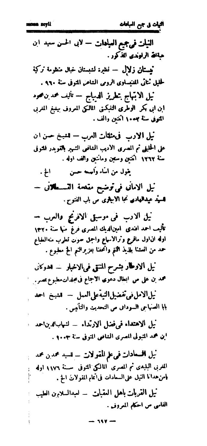 نيل الأرب في موسيقى الإفرنج والعرب - تأليف أحمد أفندي أمين الديك المصري فرغ منها سنة 1320 أوله أن أول ما قرع وتر الإسماع واجمل صوت تطرب منه الطباع حمد من أنعشنا بلذيذ النغم وأتحفنا بغزير النعم الخ مطبوع.