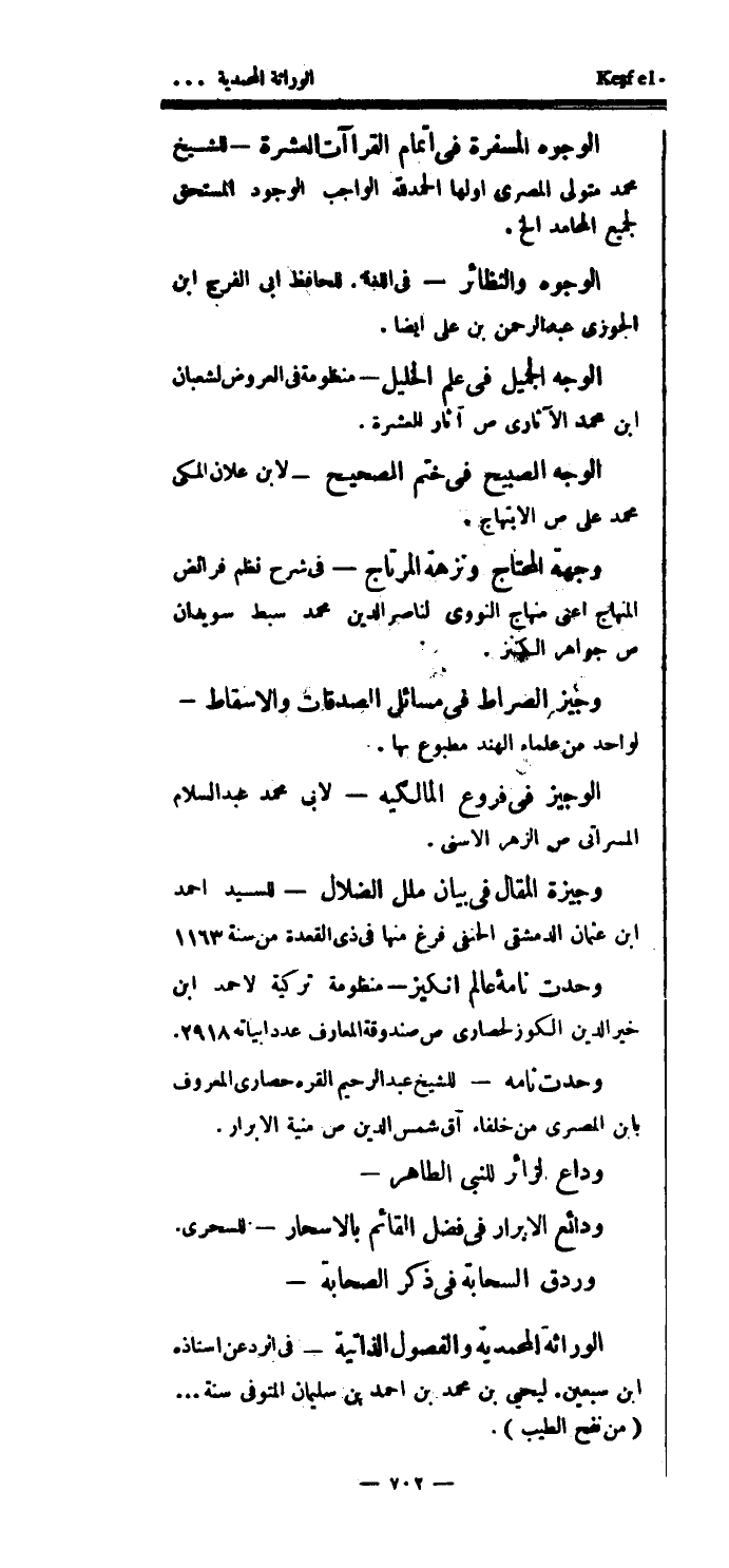 وجيزة المقال في بيان ملل الضلال - للسيد أحمد ابن عثمان الدمشقي الحنفي فرغ منها في ذي القعدة من سنة 1163 وحدت نامهء عالم انكيز - منظومة تركية لأحمد ابن خير الدين الكوز لحصاري ص صندوقة المعارف عدد أبياته 2918.