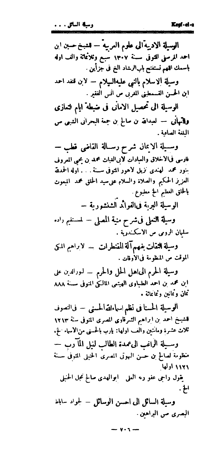 الوسيلة الأدبية إلى علوم العربية - للشيخ حسين ابن أحمد المرصفي المتوفى سنة 1307 سبع وثلاثمائة وألف أوله باسمك اللهم نستفتح باب الرشاد الخ في جزأين.