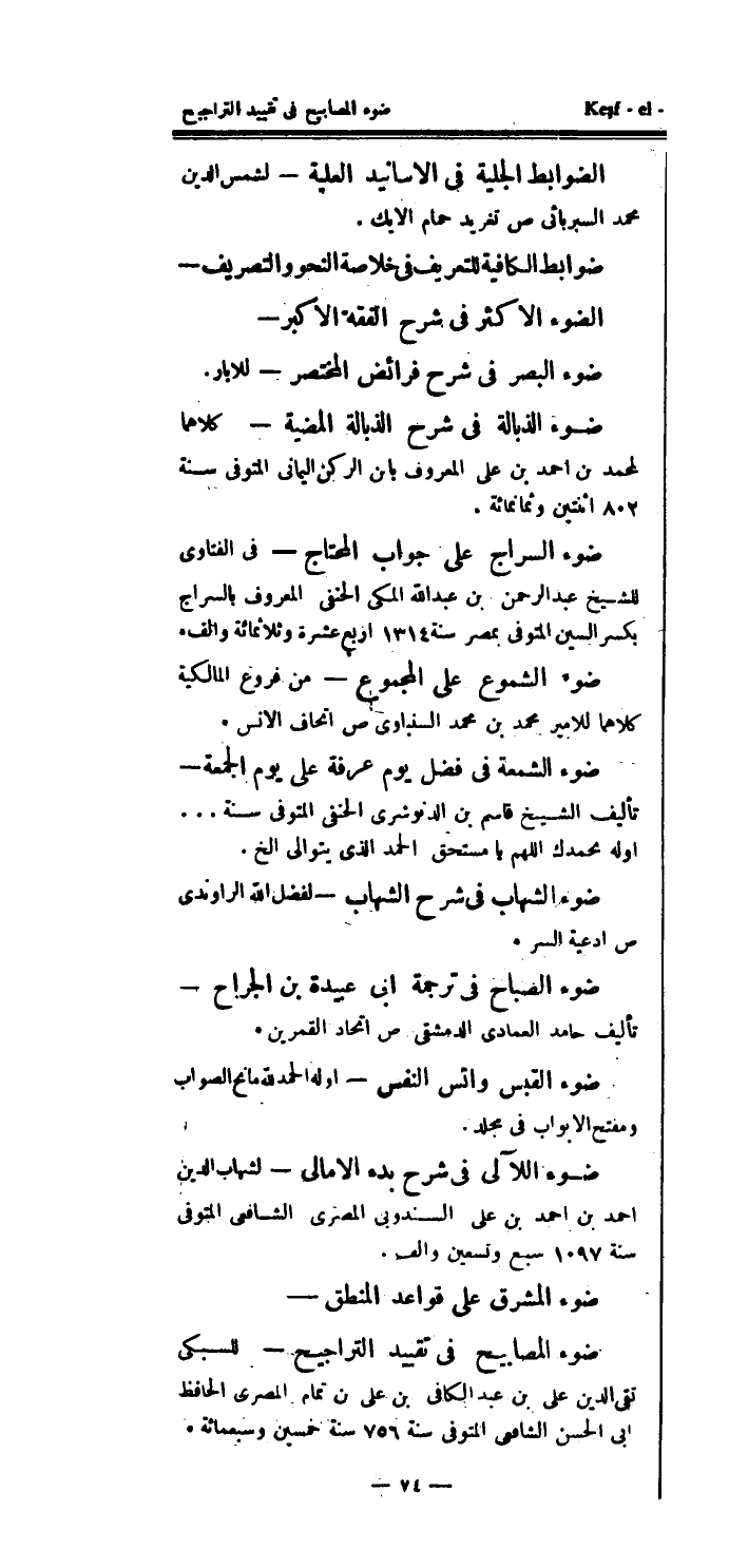 ضوابط الكافية للتعريف في خلاصة النحو والتصريف - الضوء الأكثر في شرح الفقه الأكبر - ضوء البصر في شرح فرائض المختصر - للابار.