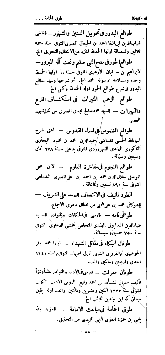 طوالع البدور في تحويل السنين والشهور - للقاضي شهاب الدين أبي البقا احمد بن الجيعان المصري المتوفى سنة 930 ثلاثين وتسعمائة أولها الحمدلله المنزه عن الانتقال والتحويل إلخ.